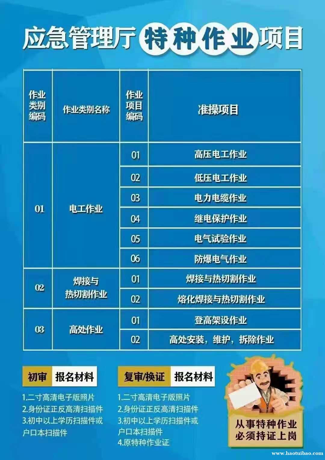 国网应急管理局VIP 工种:电力电缆、继电保护、电气试验、制冷与空调、低压电工、高压电工、焊工、登高架设、高处安装维护拆除 资料:身份证扫描件,毕业证扫描件,高清电子版白底照片